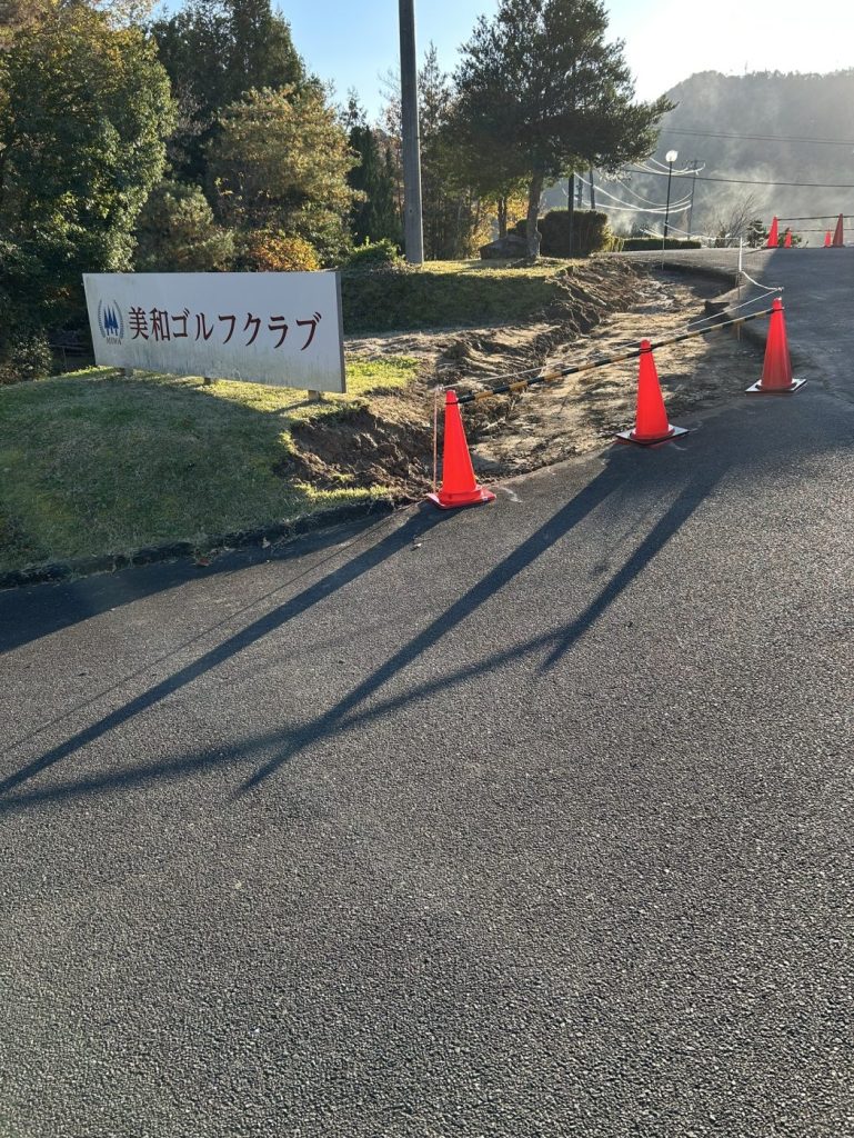 一部工事を行なっております。道幅が若干狭くなっている